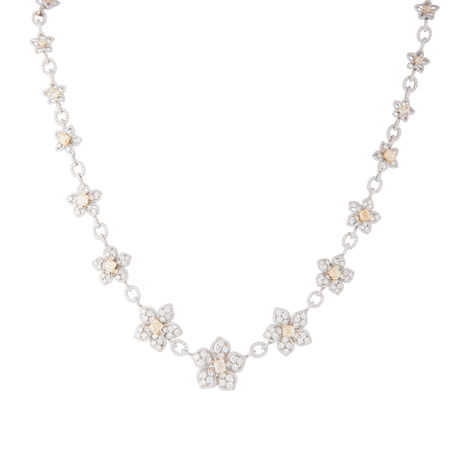Capturing the essence of summer and blossom, this necklace is made with natural yellow diamonds  and white diamonds in am aureate floral pattern.