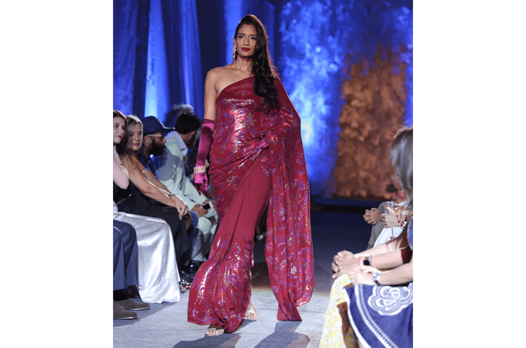 This season we have worked with new colour palette and fabrics. Deep maroons and purples in two toned silks, ombre dyed organza in shades of yellow , gold and copper diaphanous lace is lined with a vibrant orange and fuchsia pink reminiscent of the times. The white on white dori and aari embroidered collection is layered with long tunics with asymmetrical hemlines and worn with draped dhoti trousers and flared sharara pants, the sheer sarees are worn over printed and embroidered petticoats and the short capes with narrow pencil pants make the collection trendy and youthful.
